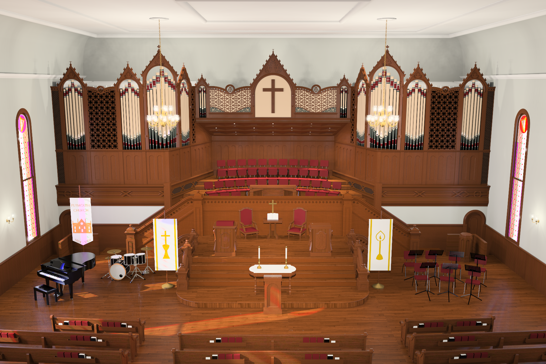 Façade, pulpit, and chancel layout by Terry Byrd Eason Design. This job involved rendering not only the façade, but also the new pulpit, a relocated baptismal font and chairs, and a moved and widened communion rail. Schoenstein had only become aware of my services shortly before a rendering was needed for an important presentation, and reached out to me with the challenge of completing the entire task within five days; I delivered the image on-time, the church approved the project, and Schoenstein is now building the organ (scroll down to the green section titled “Upcoming Projects”).