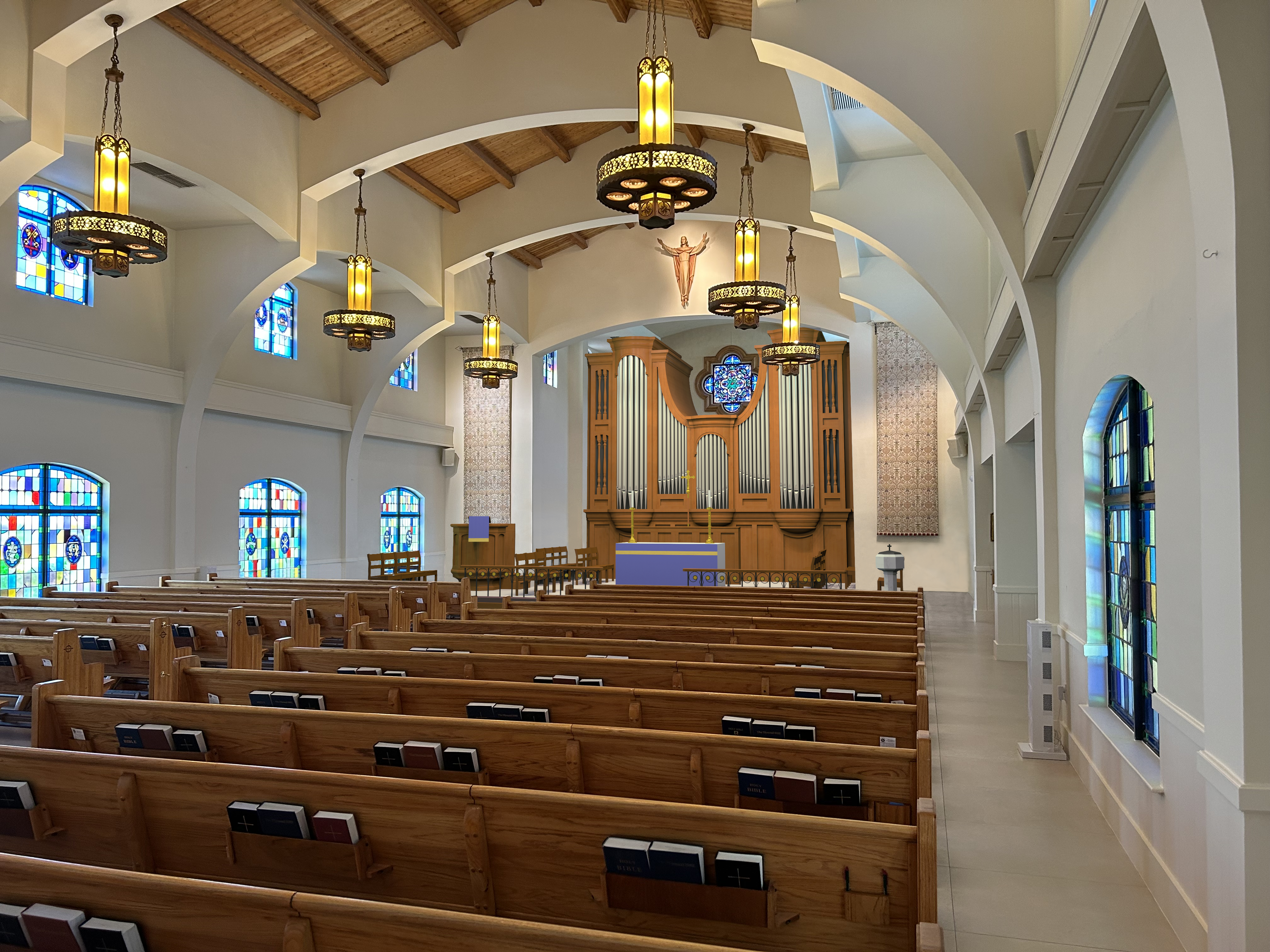 Façade, pulpit, and chancel layout by Terry Byrd Eason Design. This job involved rendering not only the façade, but also the new pulpit, a relocated baptismal font and chairs, and a moved and widened communion rail. Schoenstein had only become aware of my services shortly before a rendering was needed for an important presentation, and reached out to me with the challenge of completing the entire task within five days; I delivered the image on-time, the church approved the project, and Schoenstein will be building the organ (scroll down to the green section titled “Upcoming Projects”).
